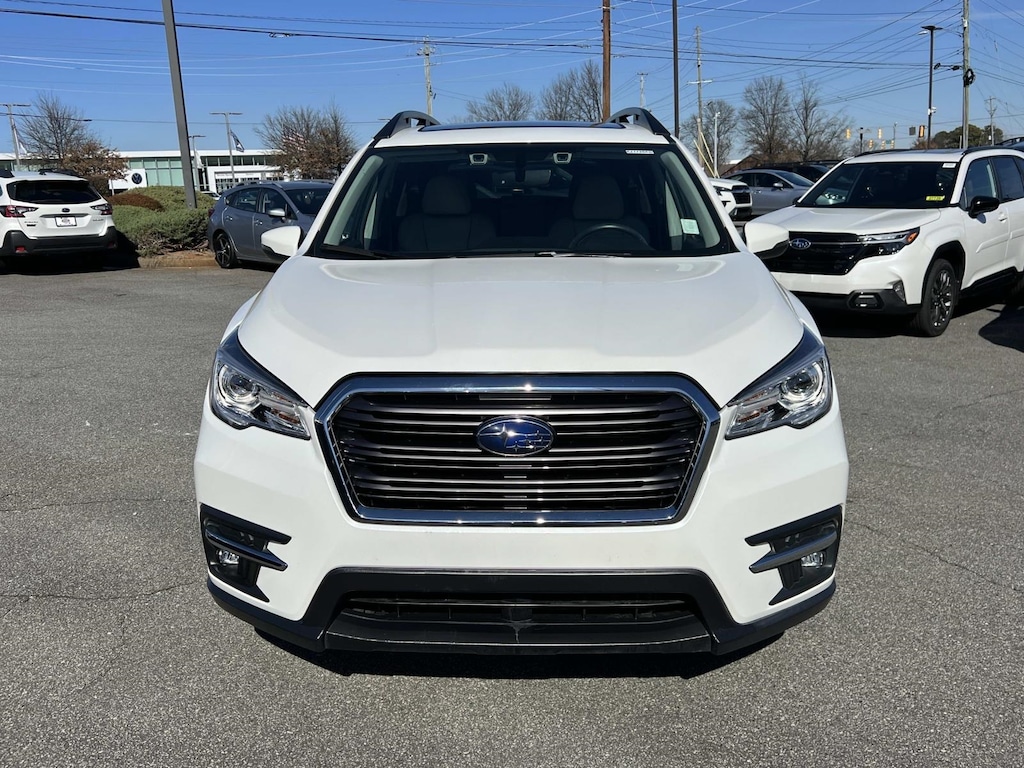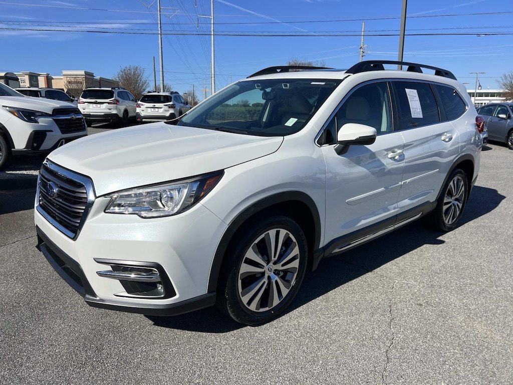 Crystal White Pearl 2019 Subaru Ascent Limited AWD Lineartronic CVT 2.4L DOHC New Feature, **Back up Camera, **Bluetooth, **Keyless Entry, Ascent Limited, 4D Sport Utility, 2.4L DOHC, Lineartronic CVT, AWD, Crystal White Pearl, Ivory Leather, 20" Alloy Wheels, 3rd row seats: bench, 4-Wheel Disc Brakes, 6 Speakers, ABS brakes, Aero Crossbar Set, Air Conditioning, All-Weather Floor Liners, Alloy wheels, AM/FM radio: SiriusXM, Auto High-beam Headlights, Auto-Dimming Exterior Mirror w/Approach Light, Auto-dimming Rear-View mirror, Automatic temperature control, Axle Ratio: 4.44, Brake assist, Bumpers: body-color, Cargo Area Cover, Cargo Tray, CD player, Compass, Crystal White Pearl Body Side Molding, Delay-off headlights, Driver door bin, Driver vanity mirror, Dual front impact airbags, Dual front side impact airbags, Dual Glass Panoramic Power Moonroof, Electronic Stability Control, Emergency communication system: STARLINK Safety and Security, Exterior Parking Camera Rear, Four wheel independent suspension, Front anti-roll bar, Front Bucket Seats, Front Center Armrest, Front dual zone A/C, Front fog lights, Front reading lights, Fully automatic headlights, Garage door transmitter: HomeLink, harman kardon & Moonroof & Nav & Cargo Area Cover, Heated door mirrors, Heated Front Bucket Seats, Heated front seats, Heated rear seats, Heated steering wheel, Illuminated entry, Knee airbag, Low tire pressure warning, Map & Reading Lights LED Upgrade - 6 Bulb Kit, Memory seat, Occupant sensing airbag, Outside temperature display, Overhead airbag, Overhead console, Panic alarm, Passenger door bin, Passenger vanity mirror, Perforated Leather-Trimmed Upholstery, Popular Package #3, Power door mirrors, Power driver seat, Power Liftgate, Power passenger seat, Power steering, Power windows, Radio data system, Radio: Subaru STARLINK 8.0" Multimedia Nav System, Radio: Subaru STARLINK 8.0" Multimedia Plus System, Rear air conditioning, Rear anti-roll bar, Rear Bumper Cover, Rear reading lights, Rear seat center armrest, Rear Seatback Protector, Rear window defroster, Rear window wiper, Remote keyless entry, Roof rack: rails only, Security system, Speed control, Splash Guards, Split folding rear seat, Spoiler, STARLINK/Apple CarPlay/Android Auto, Steering wheel mounted audio controls, Tachometer, Tilt steering wheel, Traction control, Trip computer, Variably intermittent wipers.