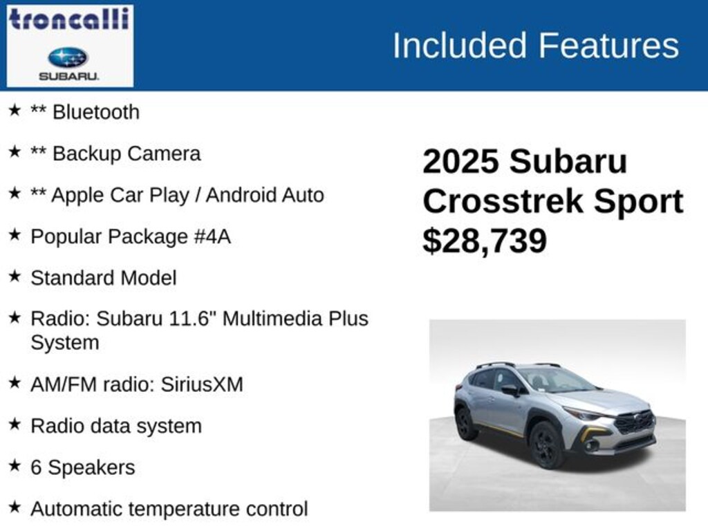 Experience the thrill of driving the 2025 Subaru Crosstrek Sport for yourself. Visit our showroom today and let our knowledgeable team guide you through all the features and capabilities of this remarkable vehicle. We're confident you'll be impressed by its exceptional value and the unparalleled ownership experience it offers.